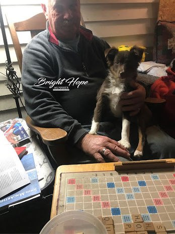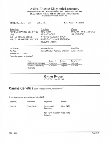 Joshua is retired from breeding and is now living with a disabled veteran as his emotional support companion. He is clear for Aussie panel, IVDD/CDDY, NAD, and non HSF4 cataracts.